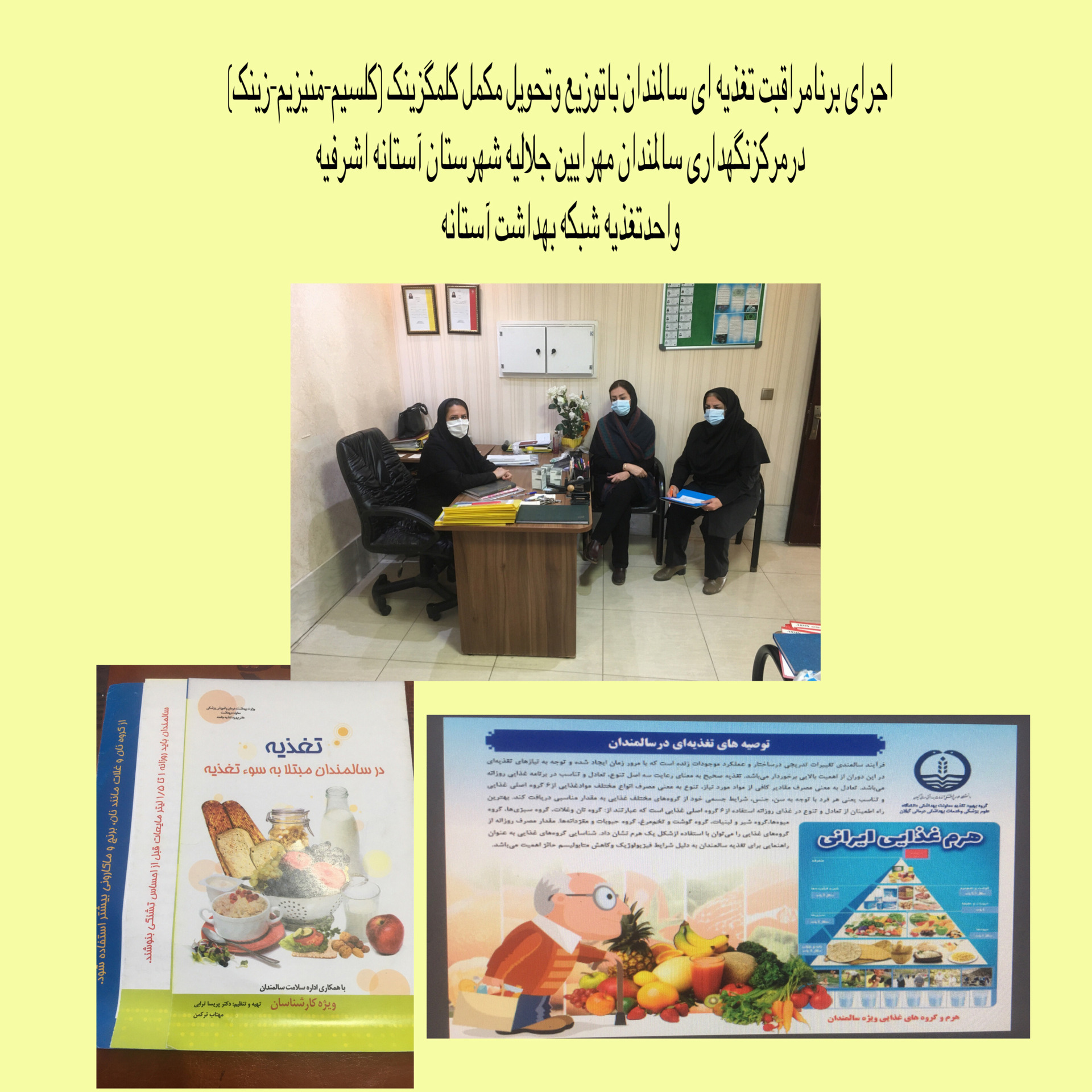 درراستای اجرای برنامه مراقبت تغذیه ای سالمندان باهدف مکمل یاری این گروه سنی توزیغ مکمل کلسیم – منیزیم – روی ( کلمگزینک) جهت سالمندان تحت پوشش مرکزنگهداری وتوانبخشی مهر آیین جلالیه شهرستان آستانه اشرفیه صورت کرفت